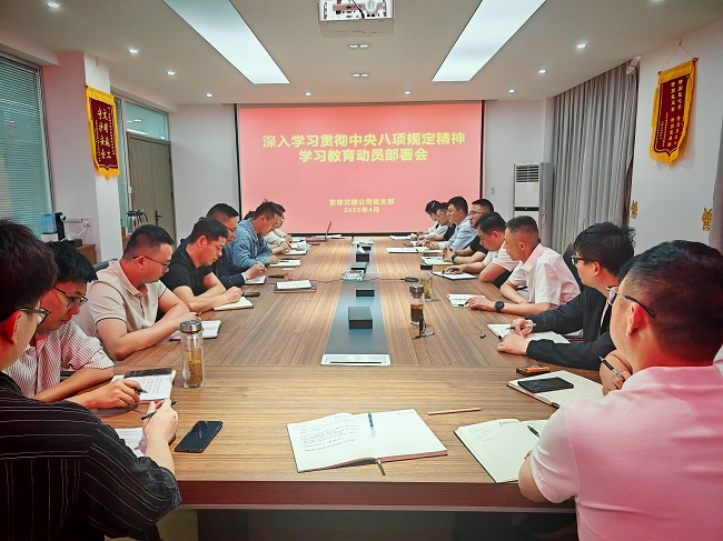 4月19日,安建交建公司黨支部召開深入學(xué)習(xí)貫徹中央八項(xiàng)規(guī)定精神學(xué)習(xí)教育動(dòng)員部署會(huì),對(duì)學(xué)習(xí)教育工作進(jìn)行動(dòng)員部署。領(lǐng)導(dǎo)班子成員、所屬黨員干部參加。