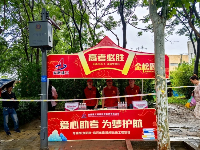 龍城路(金陽路-臨河東路)維修改造工程項目部志愿者們在合肥市通用技術學校考點外搭建遮陽棚,為考生們和家長提供臨時休息區,溫馨提醒往來考生檢查考試必需品及相關證件,還準備了多品類文具、飲用水、紙巾等,以備考生不時之需。
