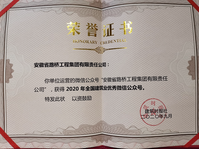 9月24日,由建筑時報社主辦的2020年建筑業微信公眾號運維經驗交流研討會暨2020年全國建筑業優秀微信公眾號頒獎典禮在揚州召開。公司微信公眾號“安徽省路橋工程集團有限責任公司”(微信號:ahlqjt)參與申報并榮獲“全國建筑業優秀微信公眾號”稱號。