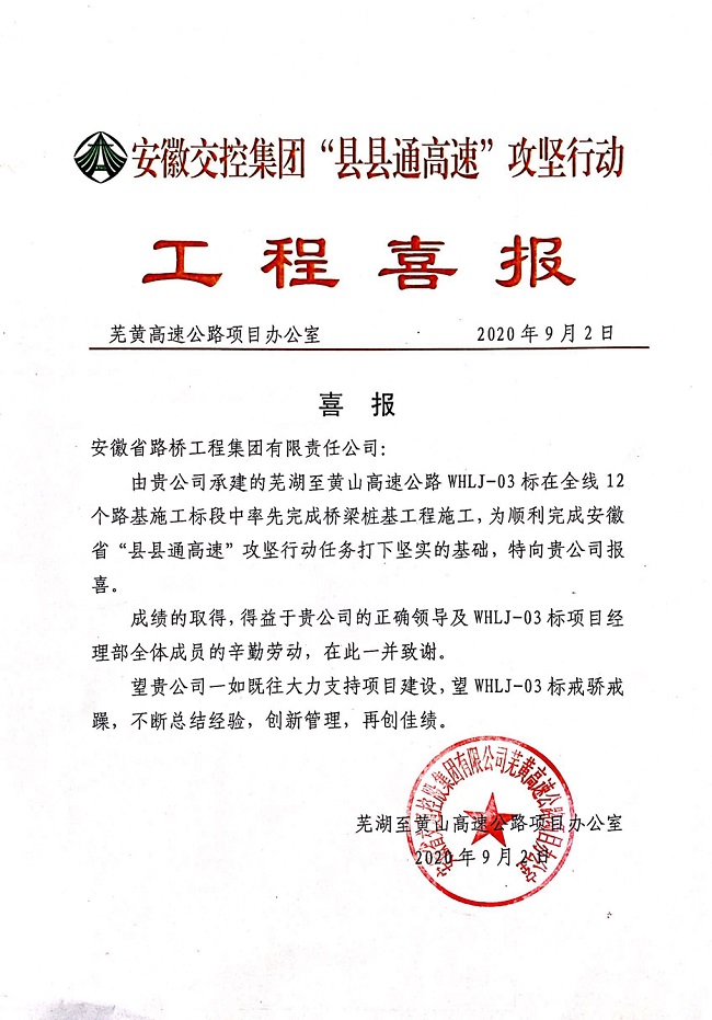 近日,公司收到安徽交控集團“縣縣通高速”攻堅行動工程喜報。安徽交控集團蕪黃高速公路項目辦公室對公司承建的蕪黃高速03標在全線12個路基施工標段中率先完成橋梁樁基工程施工,為順利完成安徽省“縣縣通高速”攻堅行動打下堅實基礎向公司報喜。