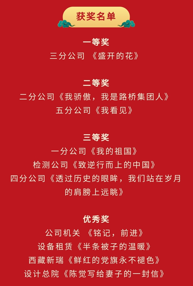 通過本次比賽,充分彰顯了公司全體員工的愛國之情、愛黨之心、愛家之意,未來我們也將繼續傳承紅色基因,爭當有信仰、有情懷、有擔當的路橋集團人。