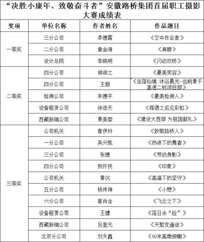 為了弘揚公司企業文化,展示企業發展成果和職工精神面貌,經過前期認真籌備和評選,12月11日,安徽路橋集團首屆職工攝影大賽結果正式出爐。