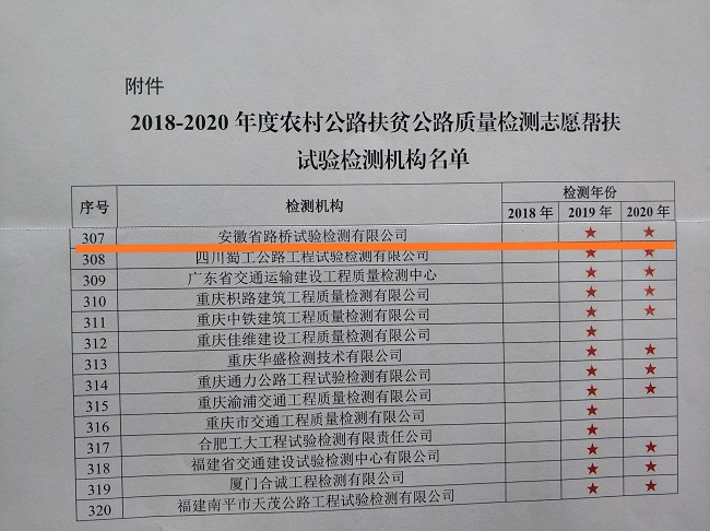 檢測(cè)公司作為安徽省交通廳優(yōu)選出的公路工程綜合甲級(jí)資質(zhì)檢測(cè)機(jī)構(gòu),根據(jù)安徽省交通運(yùn)輸廳關(guān)于全省農(nóng)村公路扶貧公路建設(shè)質(zhì)量安全檢測(cè)志愿幫扶工作文件要求,在2019年和2020年積極參加國(guó)家扶貧檢測(cè)工作。由檢測(cè)公司副總經(jīng)理佐群同志領(lǐng)隊(duì),組織了一支以黨員同志為主的檢測(cè)隊(duì)伍,承接了安徽省多地的扶貧檢測(cè)工作。在扶貧監(jiān)測(cè)工作中,檢測(cè)公司全體員工始終不忘初心、牢記使命,發(fā)揮路橋集團(tuán)、檢測(cè)公司人不怕苦、不怕累、頑強(qiáng)拼搏的實(shí)干精神,堅(jiān)持按檢測(cè)計(jì)劃順利圓滿的完成了相關(guān)檢測(cè)工作,為國(guó)家脫貧攻堅(jiān)工作奉獻(xiàn)自己的一份力量。