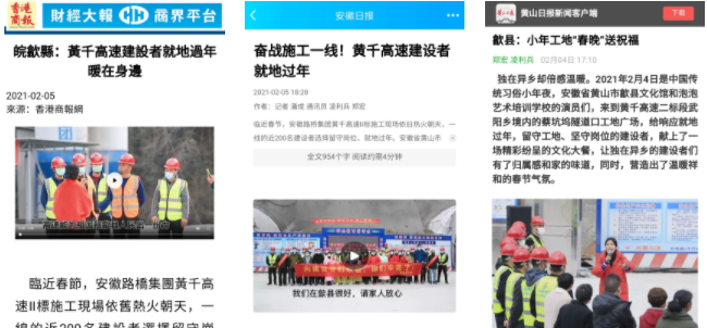 臨近春節,安徽路橋集團黃千高速Ⅱ標施工現場依舊熱火朝天,一線近200名建設者選擇留守崗位、就地過年。安徽省黃山市歙縣的文藝志愿服務小分隊和項目駐地的武陽鄉黨委政府組織了多種形式的慰問服務活動,給廣大就地過年的建設者送上新春祝福。《安徽日報》、《香港商報》、《黃山日報》對此進行了相關報道。