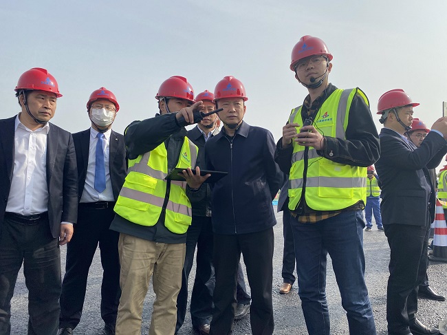 在G347安九二期PPP項(xiàng)目路面施工現(xiàn)場,趙時(shí)運(yùn)饒有興致地觀摩智能無人駕駛瀝青攤鋪試驗(yàn)段施工,并與技術(shù)人員就車輛定位、無線通信、自動(dòng)控制和可視化技術(shù)進(jìn)行深入交流。在楊灣河特大橋施工現(xiàn)場,趙時(shí)運(yùn)詳細(xì)了解了項(xiàng)目部依托“BIM+物聯(lián)網(wǎng)”技術(shù)的智慧工地建設(shè)情況,觀看了物料集成系統(tǒng)演示。