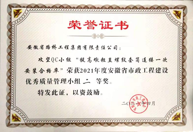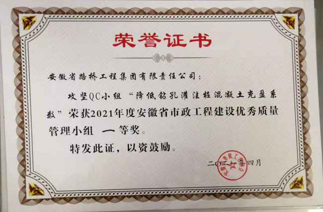 近日,從安徽省建設行業(yè)質量與安全協(xié)會、安徽省市政協(xié)會傳來喜訊,由安徽省建設行業(yè)質量與安全協(xié)會主辦的2021年省建筑企業(yè)QC小組活動成果及工程建設質量信得過班組建設活動培訓交流會和2021年度安徽省暨合肥市市政工程建設優(yōu)秀QC小組活動成果發(fā)布會活動中,安徽路橋集團三分公司欒盧攻堅QC小組完成的《降低鉆孔灌注樁混凝土充盈系數(shù)》榮獲安徽省建筑業(yè)企業(yè)2021年QC小組活動成果發(fā)布會一等獎、安徽省市政工程建設優(yōu)秀質量管理小組一等獎,《提高墩粗直螺紋套筒一次性安裝合格率》榮獲安徽省建筑業(yè)企業(yè)2021年QC小組活動成果發(fā)布會三等獎、安徽省市政工程建設優(yōu)秀質量管理小組二等獎,同時入選河南省建筑業(yè)協(xié)會組織的2021河南省建設質量管理小組交流成果。