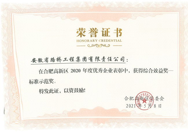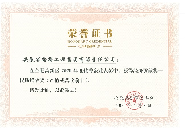 2020年,安徽路橋集團先后打贏疫情防控阻擊戰、抗洪搶險保衛戰、“十三五”發展收官戰,各項經濟指標穩步增長,對高新區的經濟發展做出了突出的貢獻,以第一主編單位獲四項省級工法,全年新簽合同額首破百億元,生產產值突破五十億元,年度產值增幅排名全區所屬企業前十,榮膺合肥高新區2020年度“標準示范獎”、“運營貢獻獎”、“提質增效獎”。
