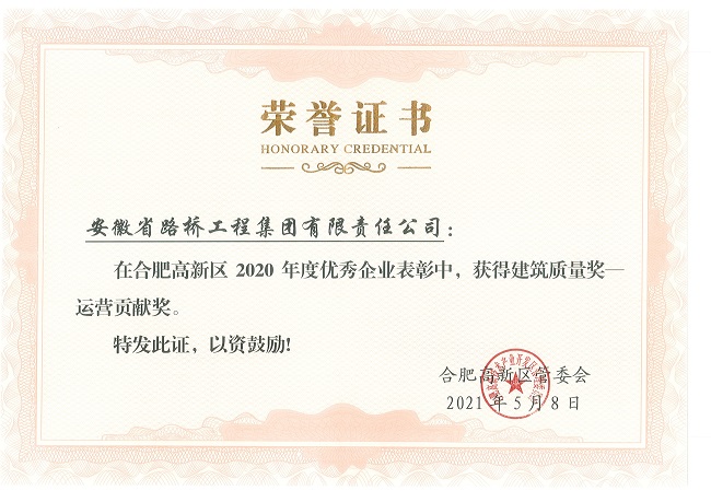 近日,合肥市高新區管委會公示了《合肥高新區2020年度擬表彰獎勵項目》企業名單,安徽路橋集團喜獲“運營貢獻獎”、“提質增效獎”、“標準示范獎”三項榮譽。