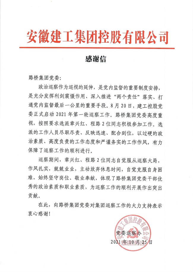建工控股黨委巡察辦稱贊公司黨委選派的章興紅、程路2位同志盡職盡責(zé)、反應(yīng)迅速、配合到位,以過硬的政治素質(zhì)、高度負(fù)責(zé)的工作態(tài)度和嚴(yán)謹(jǐn)務(wù)實(shí)的工作作風(fēng),為巡察工作的順利進(jìn)行提供了有力的保障,充分展現(xiàn)了路橋集團(tuán)黨委干部?jī)?yōu)秀的政治素質(zhì)和專業(yè)素質(zhì)。