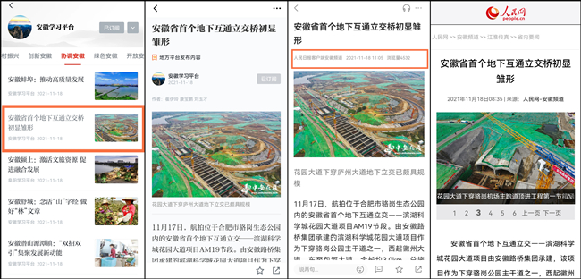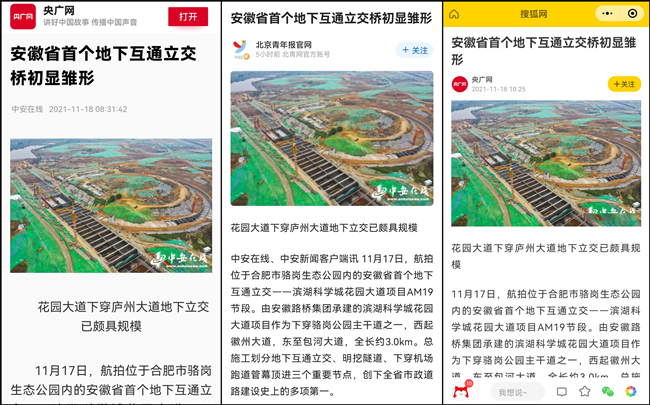 11月18日,安徽惟一重點新聞門戶網站——中安在線于首頁頭版位置以《安徽省首個地下互通立交橋初顯雛形》為題,以圖文形式,聚焦安徽路橋集團濱湖科學城花園大道項目施工進展情況,對項目創下全省市政道路建設史上的多項第一予以重點報道。稿件隨后被學習強國、人民日報客戶端、人民網、央廣網、北青網、騰訊網、新浪網等多家主流媒體轉載發布,路橋集團建設者攻堅克難,斗志昂揚的良好精神風貌被予以細致描繪,公司良好企業形象得到進一步彰顯。