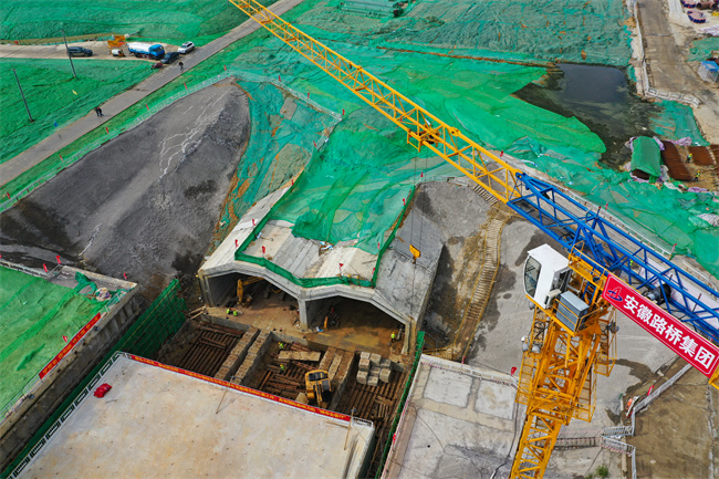 在安徽路橋集團承建的濱湖科學城花園大道項目工地上,記者看到塔吊林立,車輛來回穿梭,機器轟鳴作響,幾十名施工人員正緊鑼密鼓地進行中板鋼筋綁扎作業。