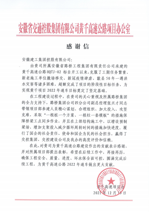 12月30日,安徽省交通控股集團有限公司黃千高速公路項目辦向安徽建工集團控股有限公司發來的感謝信,對安徽路橋集團為黃千高速公路建設作出的突出貢獻表示感謝,并對所屬黃千高速02標項目部予以表彰。