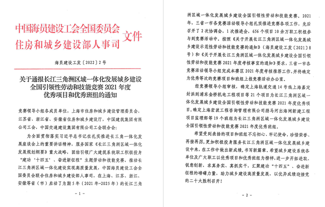 為全面貫徹落實習近平總書記在扎實推進長三角一體化發展座談會上的重要講話精神,服務國家《長江三角洲區域一體化發展規劃綱要》重大戰略,推動長江三角洲區域一體化建設高質量發展,中國海員建設工會全國委員會聯合住房和城鄉建設部,在上海、江蘇、浙江、安徽省(市)啟動了為期5年(2021年-2025年)的長江三角洲區域一體化發展城鄉建設全國引領性全國勞動和技能競賽。今年共有656個項目10余萬職工積極參與到競賽活動中來,最終僅21個項目榮獲年度優秀項目。