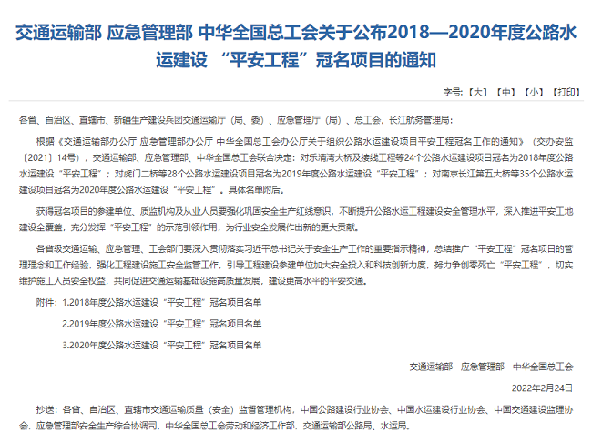 作為我國公路水運工程建設領域安全生產管理方面的最高榮譽,“平安工程”有著安全管理領域“魯班獎”的美譽,冠名項目均為全國各地建設規模大、施工工藝復雜、作業安全風險高、建設成效顯著的建設工程。