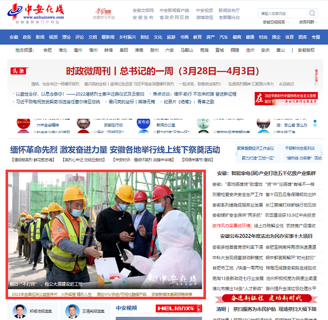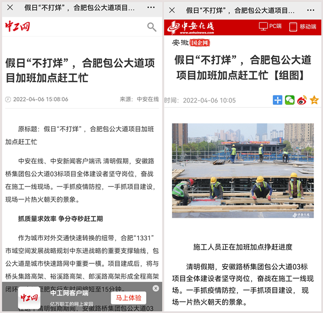 4月6日,中安在線以《假日“不打烊”,合肥包公大道項目加班加點趕工忙》為題,于網站首頁圖片新聞頭版位置對路橋集團包公大道03標項目清明假期期間的疫情防控與項目建設進行重點報道。稿件獲中華全國總工會主管主辦、工人日報社領導和管理的大型綜合性中央新聞網站中工網轉載。