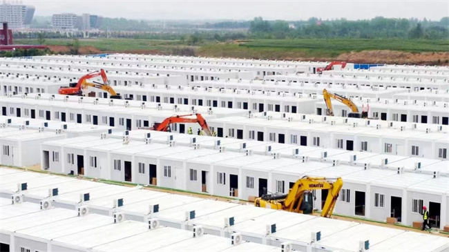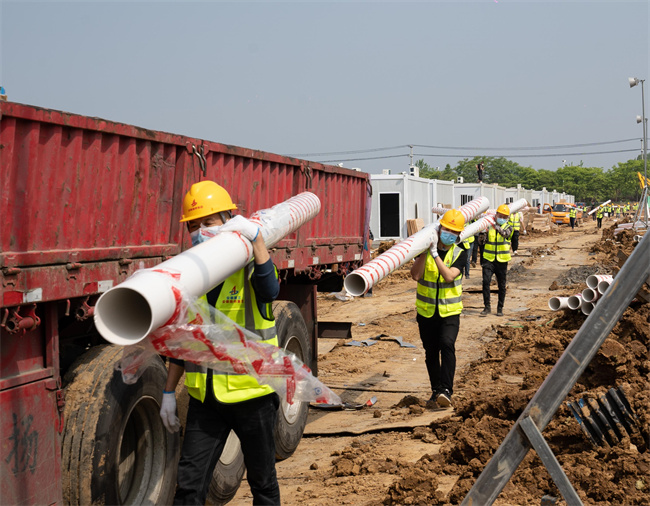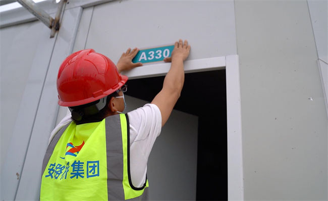 面對期短量大、環(huán)境艱苦、疫情嚴峻、資源調(diào)配難等困難,項目部成立黨員先鋒隊、青年突擊隊,用實際行動以沖鋒者的姿態(tài)全力保障工期,將一個個“不可能”變?yōu)楝F(xiàn)實。4月17日,A區(qū)360套隔離間完工交付。4月20日,A、B區(qū)共1000套隔離間完工交付。