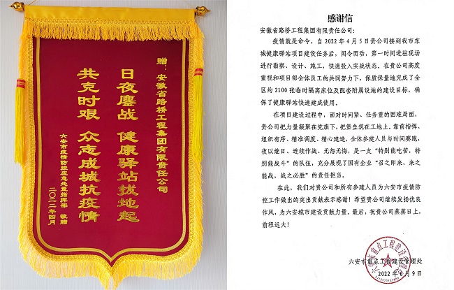 錦旗和感謝信是榮譽(yù),更是激勵。路橋集團(tuán)將繼續(xù)發(fā)揚優(yōu)良作風(fēng),始終保持奮進(jìn)之姿,以實際行動為六安市疫情防控和城市建設(shè)作出更大的貢獻(xiàn)。