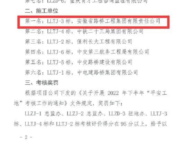 近日,河南省欒盧高速建設(shè)有限公司組織欒盧高速項(xiàng)目6個(gè)標(biāo)段開展2022年上半年平安工地考核,安徽路橋集團(tuán)欒盧高速03標(biāo)段喜獲全線“第一名”的傲人成績(jī),有力彰顯了公司企業(yè)形象。