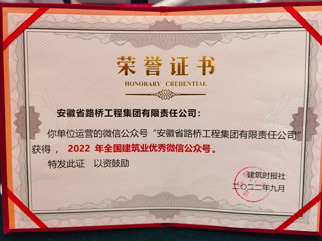 9月25日,2022年建筑業(yè)微信公眾號(hào)運(yùn)維經(jīng)驗(yàn)交流研討會(huì)暨全國建筑業(yè)優(yōu)秀公眾號(hào)頒獎(jiǎng)典禮在湖北省武漢市召開。連續(xù)三年,公司微信公眾號(hào)“安徽省路橋工程集團(tuán)有限責(zé)任公司”(微信號(hào):ahlqjt)再獲“全國建筑業(yè)優(yōu)秀微信公眾號(hào)”榮譽(yù)稱號(hào)。