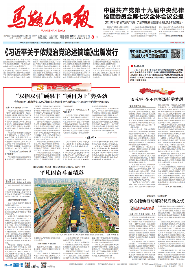 企業(yè)生產(chǎn)不斷檔,重點項目不停工。國慶假期,舉國歡慶之時,《馬鞍山日報》頭版稿件《平凡因奮斗而精彩》報道路橋集團馬鞍山九華路項目建設(shè)者堅守崗位、奮戰(zhàn)一線,扎實工作,銳意進取,用只爭朝夕的干勁和腳踏實地的勞動迎接黨的二十大勝利召開。
