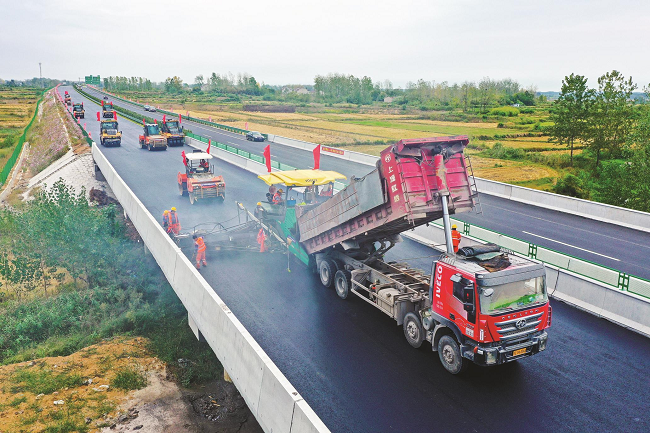 9月28日,滁天高速來安縣半塔鎮(zhèn)境內(nèi),安徽路橋集團筑路工人們正在抓緊時間鋪設(shè)瀝青。滁天高速公路項目起自來安縣水口鎮(zhèn)甲埂村,終于天長市開發(fā)區(qū)南側(cè)陸營村,全長約 67.085公里,是安徽省“四縱八橫”高速公路網(wǎng)中“橫六”的重要組成部分。項目建成后,滁 州至天長兩地間的行車距離將大大減少,進一步打通了北沿江高速通道,對促進長江經(jīng)濟 帶一體化發(fā)展具有重要意義。據(jù)了解,該路段預(yù)計今年11月底建成通車。