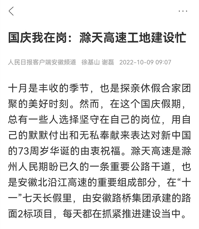 10月9日,人民日報客戶端以《國慶我在崗:滁天高速工地建設忙》為題,報道路橋集團滁天高速項目在國慶長假期間,每日抓緊推進施工生產,用辛勤勞動和實干業績迎接黨的二十大勝利召開。
