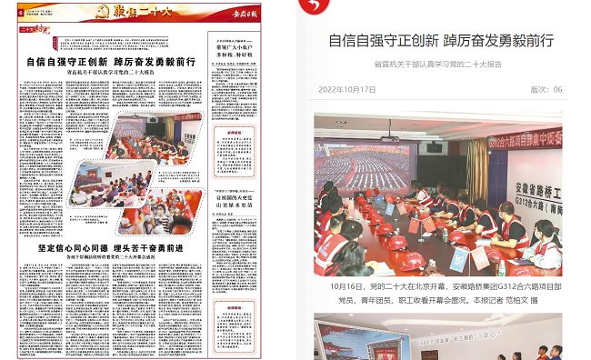 2022年10月17日,《安徽日?qǐng)?bào)》“聚焦二十大”專版,以《自信自強(qiáng)守正創(chuàng)新 踔厲奮發(fā)勇毅前行——省直機(jī)關(guān)干部認(rèn)真學(xué)習(xí)黨的二十大報(bào)告》為題,圖片新聞形式報(bào)道G312合六路項(xiàng)目部黨員、青年團(tuán)員、職工收看開幕會(huì)盛況。